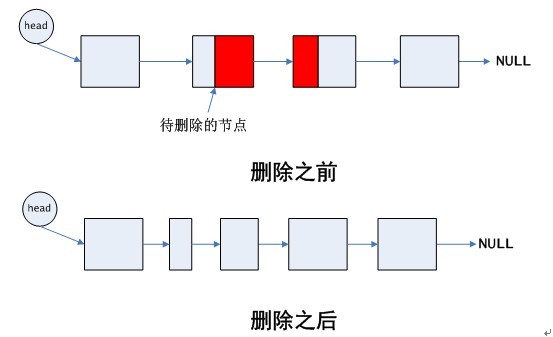 首先定位删除元素的位置,然后按照数组删除元素的方法删除该数据。如果删除一大块数据,首先要定位数据块首元素和末元素所在的位置,然后分别将它们所在的节点分裂成两个节点,最后删除首元素和末元素之间的节点即可。