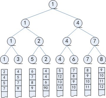 胜者树的一个优点是,如果一个选手的值改变了,可以很容易地修改这棵胜者树。只需要沿着从该结点到根结点的路径修改这棵二叉树,而不必改变其他比赛的结果。下面是选择一个最小的数字为最胜利者(见图1所示),第一次把各个数组里面的第一个元素都放进去,这是根据胜利树的规则两两比较,得到最小的值,第一次弄完之后,就得出1数字是胜利的,也就是1是最小的。在下一次输出第二小的数字时候,只需要把1所在的数组里面的元素加进去,然后从叶子节点到根节点一直比较得出第二小的值,这样就减少了很多次无用的比较(见图2所示)。