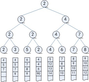 假设有k个称为顺串的有序序列,我们希望将他们归并到一个单独的有序序列中。每一个顺串包含一些记录,并且这些记录按照键值的大小,以非递减的顺序排列。令n为k个顺串中的所有记录的总数。并归的任务可以通过反复输出k个顺串中键值最小的记录来完成。键值最小的记录的选择有k种可能,它可能是任意有一个顺串中的第1个记录。并归k个顺串的最直接的办法就是进行k-1次比较确定下一个输出的记录。对k>2,我们可以通过使用选择数这种数据结构来降低寻找下一个最小元素所需要进行的比较次数。有两个种选择树:胜利树和失败树。